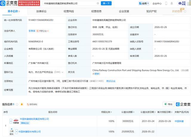 企查查APP显示,近日,中铁建港航局集团新能源有限公司成立,法定代表人为李育斌,注册资本为3亿元,经营范围包含:风力发电技术服务;储能技术服务;新兴能源技术研发;发电业务、输电业务、供(配)电业务等。企查查股权穿透显示,该公司由中国铁建(601186.SH)旗下中国铁建港航局集团有限公司全资持股。